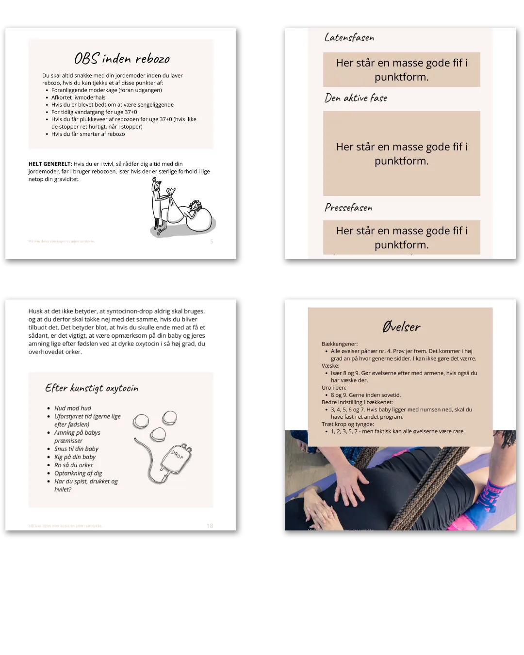 Her kan du se et par sider fra bøgerne. Bøgerne er smækfyldt med konkrete tips og viden og så er der nemme printbare sider, lige til at stikke i lommen til fødslen.